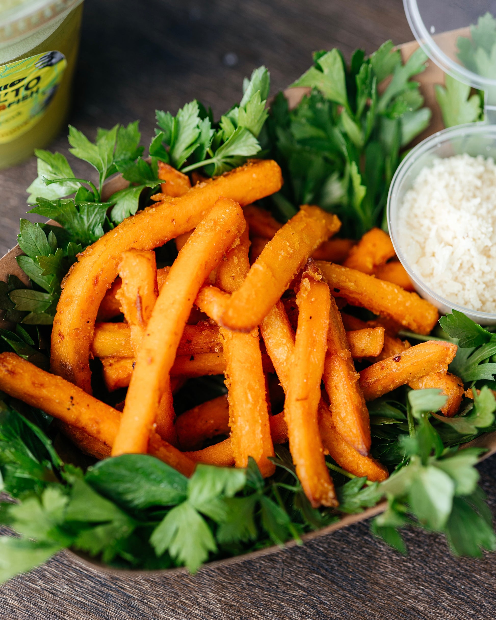 Хрусткі шматочки батату, смажені до ідеалу, з легким золотистим відтінком, посипані ароматним пармезаном, який додає страві особливого смаку. Ніжний батат з його природною солодкістю чудово контрастує з солонуватим та пікантним пармезаном. Ідеальний вибір для тих, хто любить нові поєднання смаків!