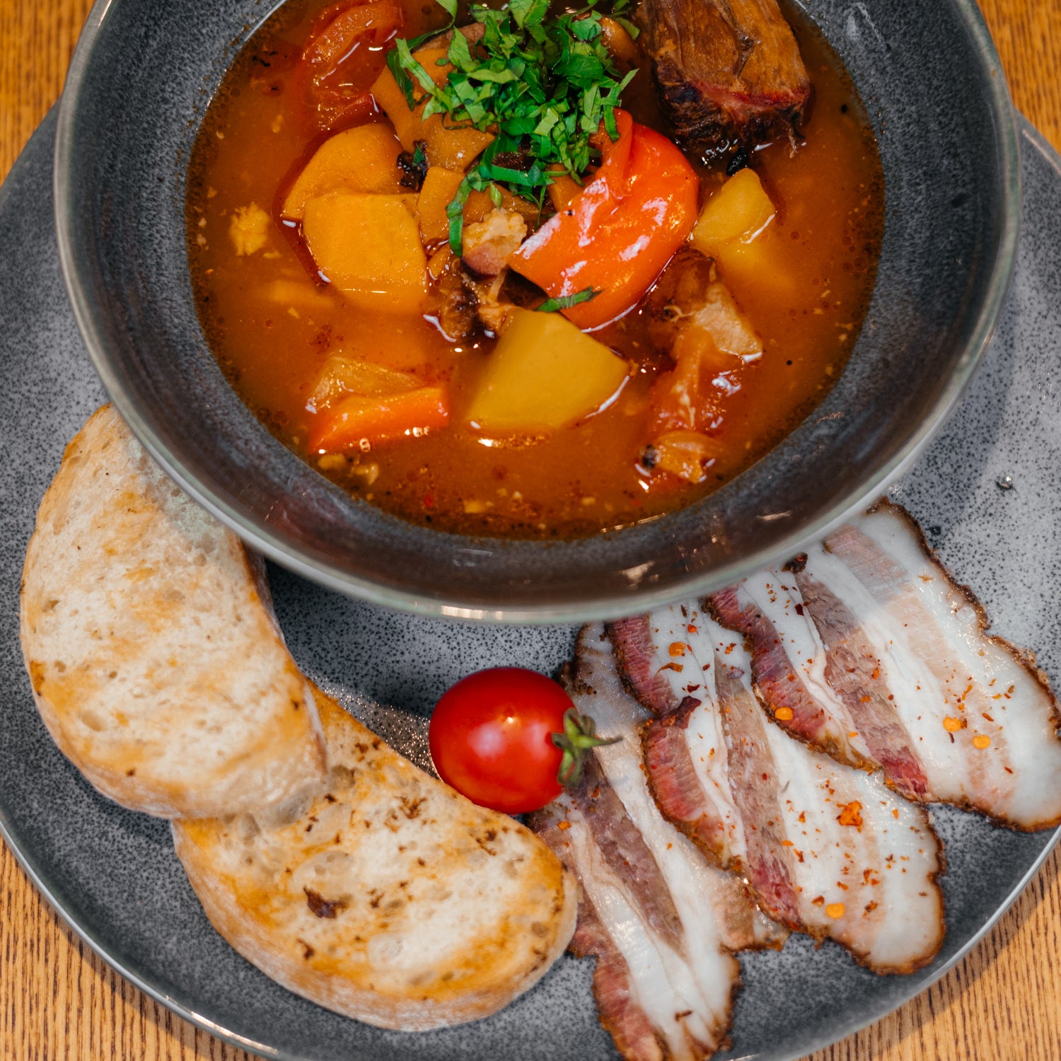 Карпатський бограч з копченим м'ясом і димком – смачний і наваристий суп, приготований з м'яса, картоплі та овочів, з легким ароматом диму, що додає страві особливого шарму. Ідеальний вибір для справжніх цінителів традиційної української їжі.