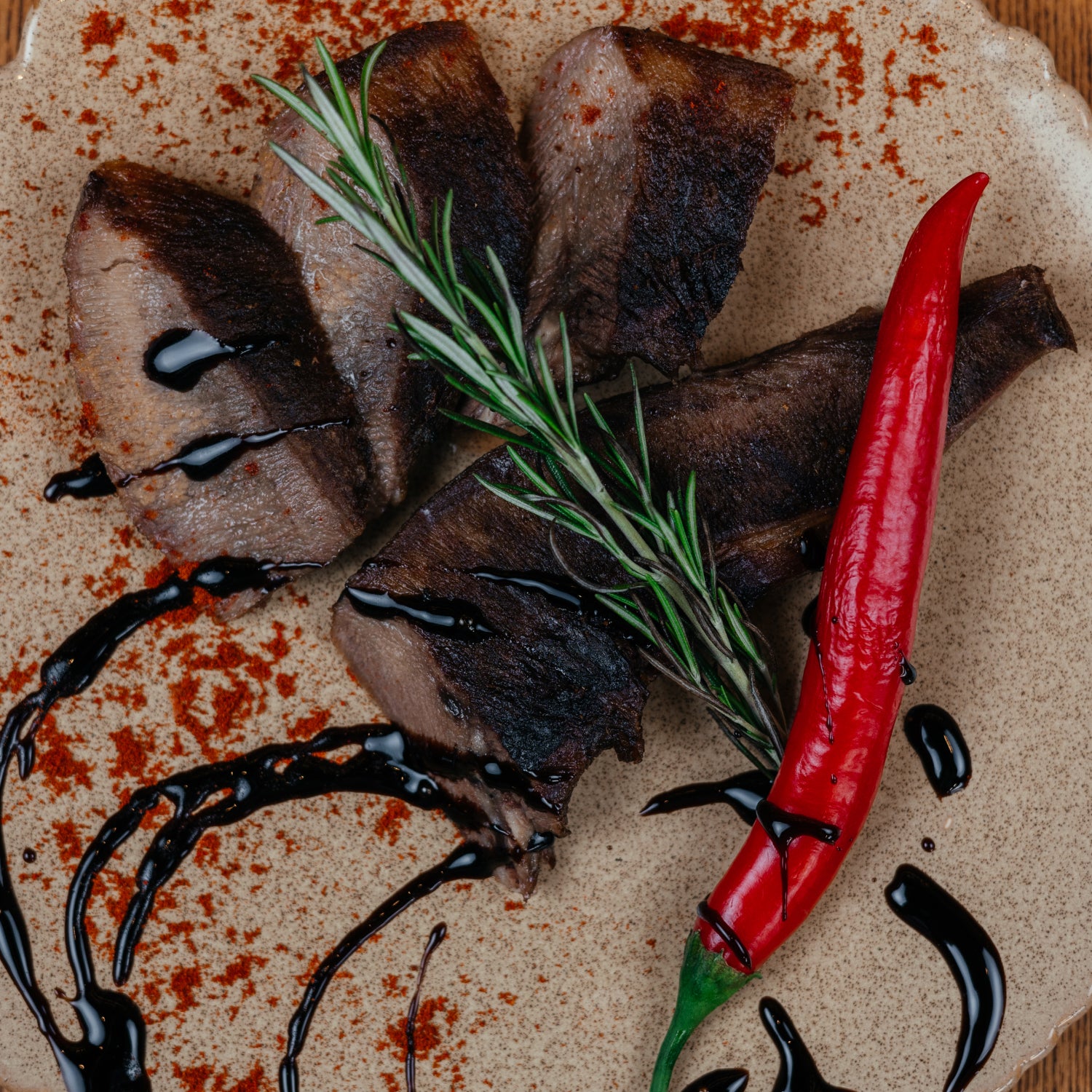 Ніжний стейк з яловичого язика, приготований до ідеальної м'якості та поданий з ароматними спеціями. Вишуканий смак і текстура, що тане в роті, роблять цю страву справжнім делікатесом для гурманів.